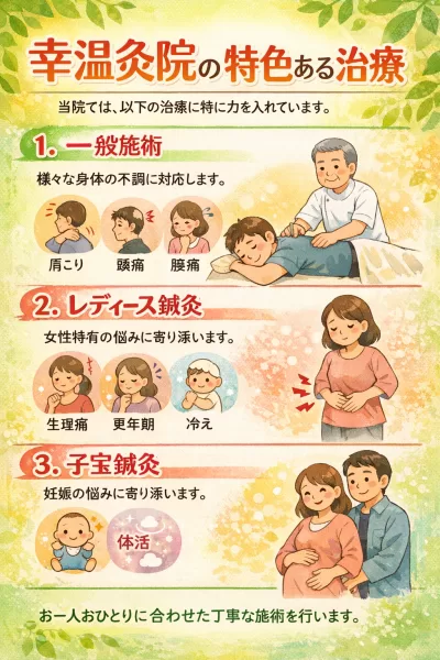 私たち夫婦で運営する幸温灸院では、患者様一人ひとりに丁寧に向き合い、最適な治療プランを提案します。土曜も営業し、18時まで診療に対応しているため、忙しい方々にも利用しやすい環境を整えています。