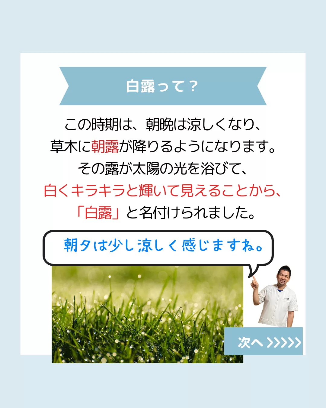 この時期は、朝晩は涼しくなり、草木に朝露が降りるようになります。その露が太陽の光を浴びて、白くキラキラと輝いて見えることから、「白露」と名付けられました。