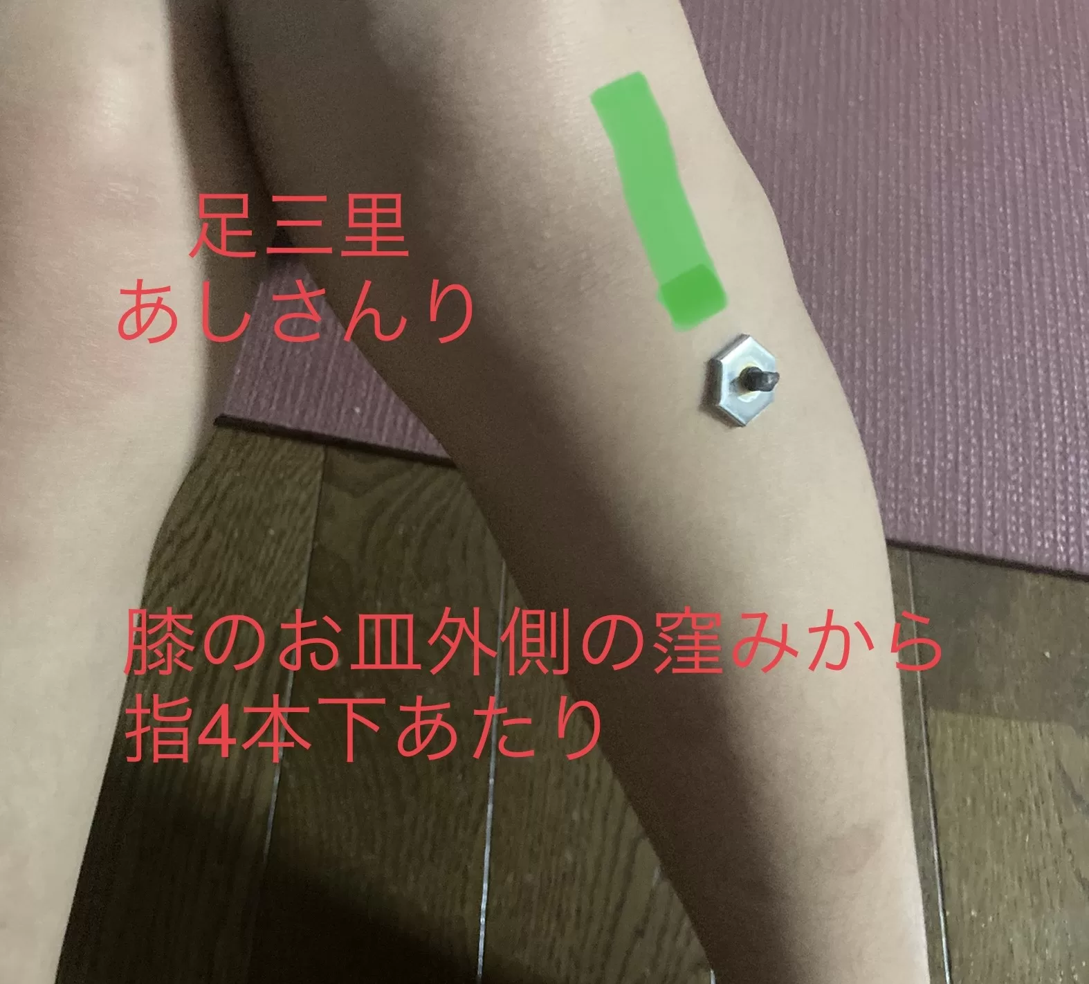 場所: 膝の皿の下の外側にあるくぼみから、指幅4本分下がったところです。